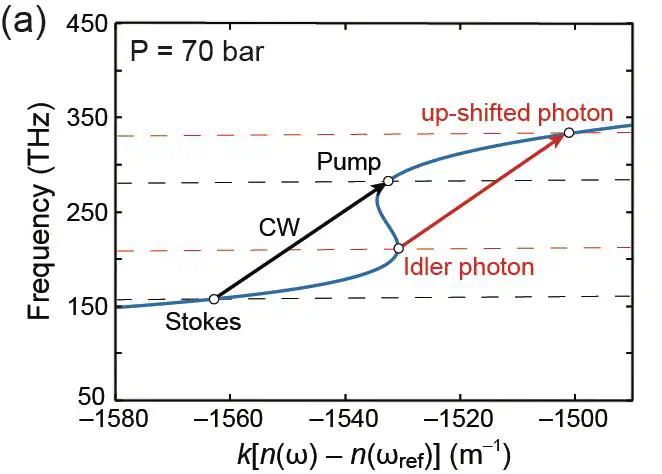 Dispersion diagramRaman coherence waves created in hydrogen-filled single-ring hollow-core PCF are used to efficiently frequency up-shift the idler photon from a biphoton pair. Quantum correlations are preserved between the signal photon and the up-shifted idler photon.